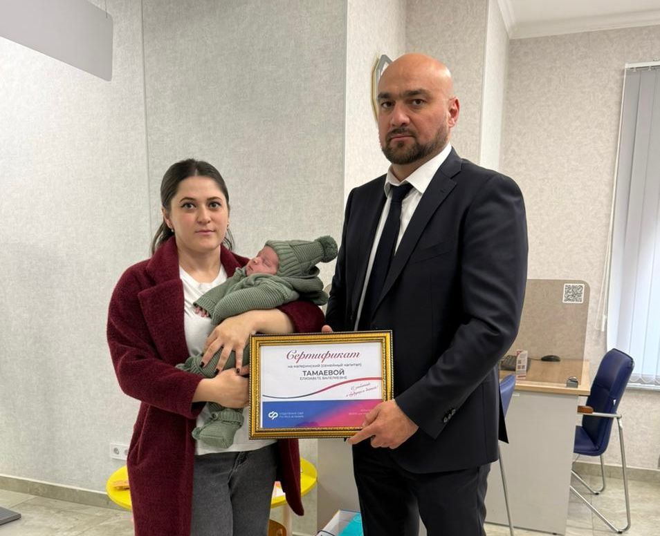 Счастливыми обладателями юбилейного, 85-тысячного сертификата, на материнский капитал стала Елизавета Кодзасова из Владикавказа. В октябре этого года у Кодзасовых родился сын Дзамболат. Молодые родители планируют направить средства государственной поддержки на улучшение жилищных условий.