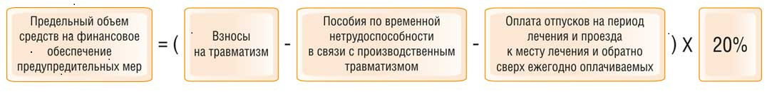 Страхователь направляет на финансовое обеспечение предупредительных мер до 20 процентов сумм страховых взносов, начисленных им за предшествующий календарный год, за вычетом расходов, произведенных в предшествующем календарном году на выплату пособий по временной нетрудоспособности в связи с несчастными случаями на производстве или профессиональными заболеваниями и на оплату отпуска застрахованного лица (сверх ежегодного оплачиваемого отпуска, установленного законодательством Российской Федерации) на весь период его лечения и проезда к месту лечения и обратно.