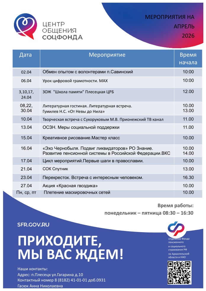 Центр общения старшего поколения располагается по адресу: п. Плесецк, ул. Гагарина, д. 10, Клиентская служба СФР в Плесецком муниципальном округе.