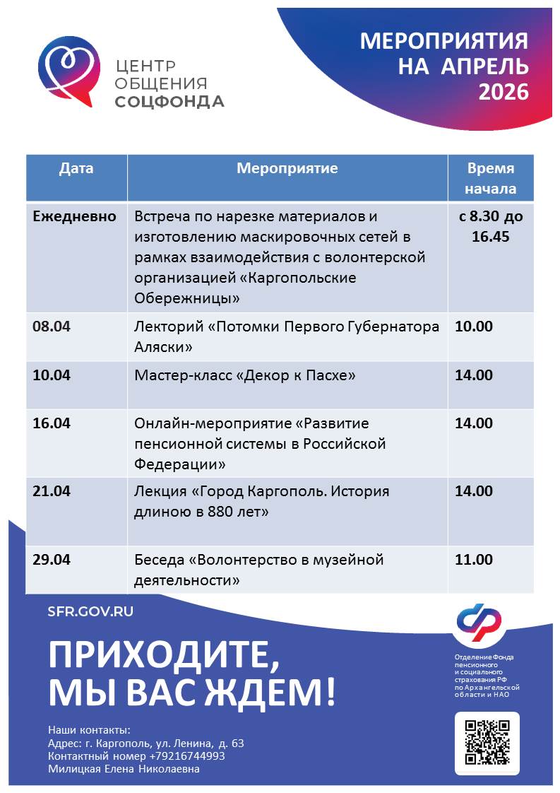 Центр общения старшего поколения располагается по адресу: г. Каргополь, ул. Ленина, д. 63, Клиентская служба СФР в Каргопольском муниципальном округе.