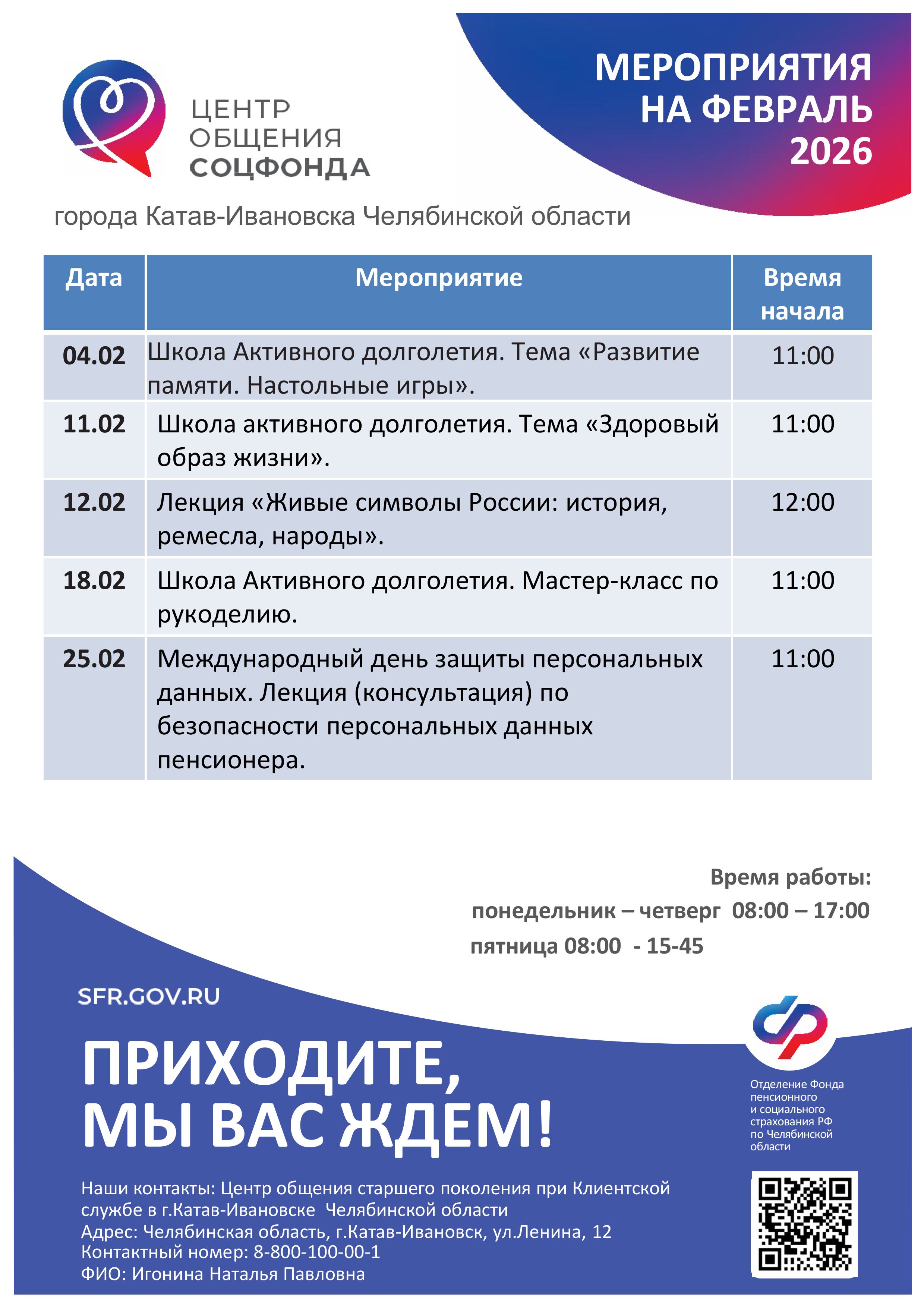 Также ознакомиться с программой встреч можно в холле клиентской службы Отделения СФР по Челябинской области в Катав-Ивановском районе.