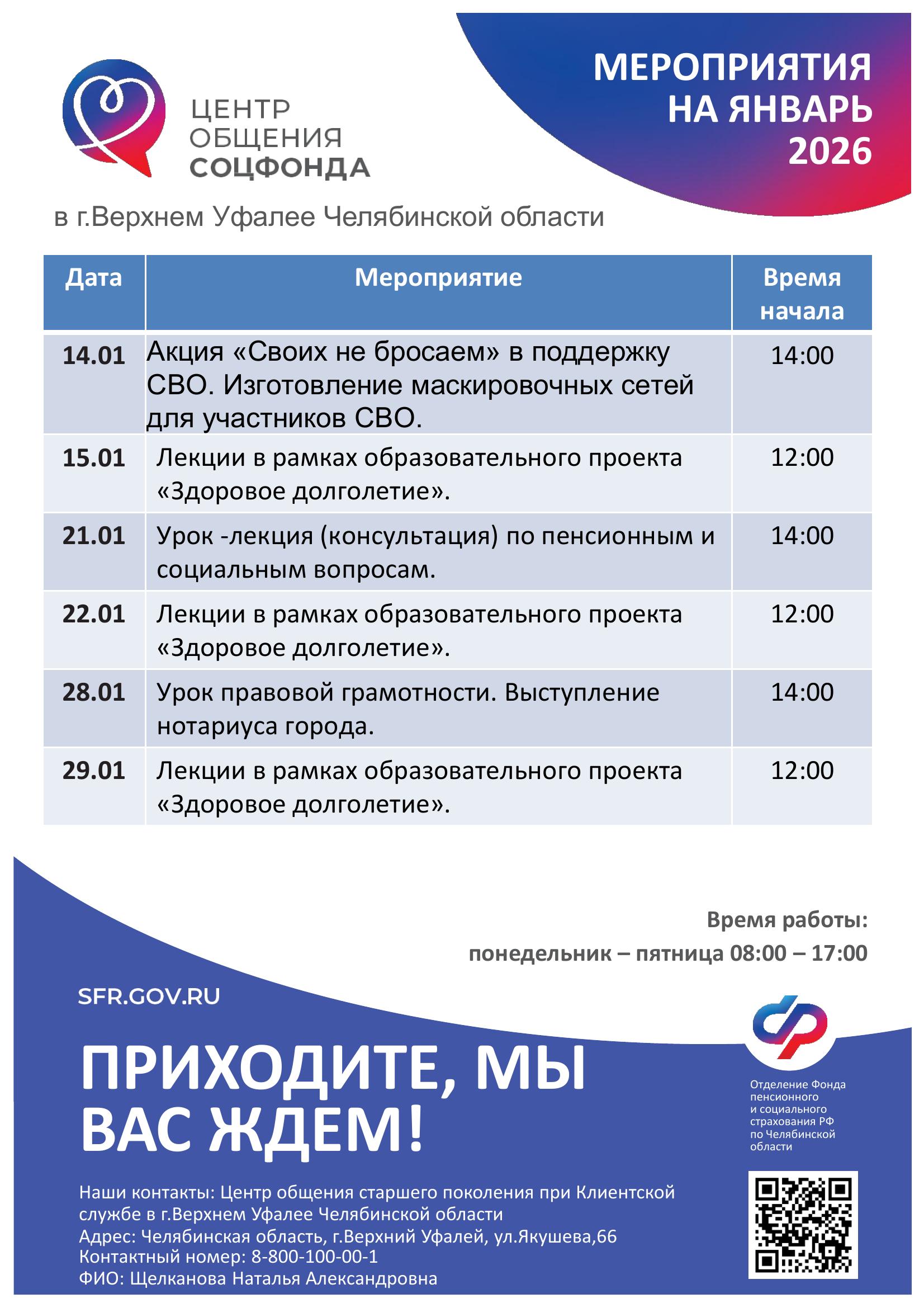 Также ознакомиться с программой встреч можно в холле клиентской службы Отделения СФР по Челябинской области в городе Верхний Уфалей.