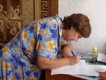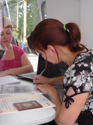 Мобильная клиентская служба дает возможность вести приемы на дому, чаще всего ею пользуются люди с ограниченными возможностями. Во время выездного приема Эльмира Салыева пришла домой к Сергею Рябкову, которому недавно была присвоена инвалидность первой группы (на фото: жена Сергея пишет необходимое заявление).