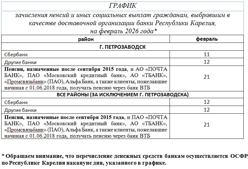 Перечисление денежных средств банкам осуществляется Отделением фонда пенсионного и социального страхования Российской Федерации по Республике Карелия накануне дня, указанного в графике.