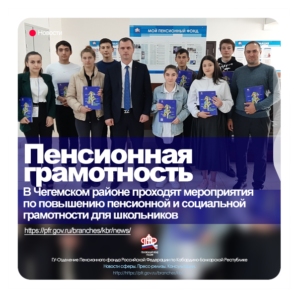 Традиционно в октябре в школах Кабардино-Балкарской Республики, как и во всех регионах страны, стартовала информационная кампания по повышению пенсионной и социальной грамотности для школьников. В рамках информационной кампании клиентскую службу фонда в Чегемском районе посетили ученики 10 класса МКОУ «СОШ №4» г. Чегема. Кроме того, сотрудниками клиентской службы в Чегемском районе был организован выезд в МКОУ «СОШ №2» г. Чегема для проведения открытого урока.