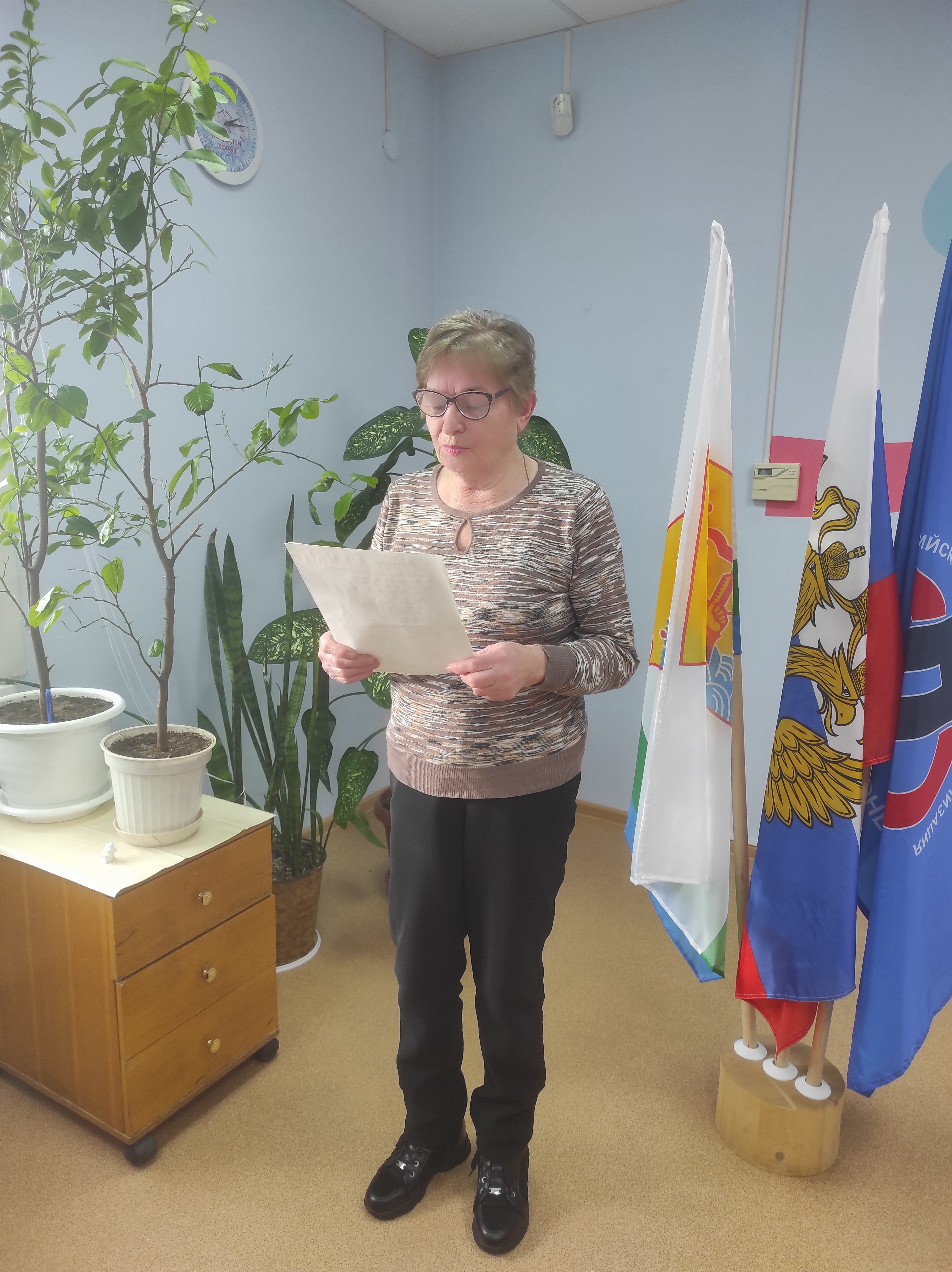 В этот день ветераны повстречались с Валентиной Семеновной Шишмаковой, которая прочла свои стихи, спела песни, рассказала о себе. Будучи в возрасте 85 лет, Валентина Семёновна имеет блестящую память, полна оптимизма, заряжает энергией друзей. Каждый четверг она проводит «День добрых дел»: звонит своим подружкам, коллегам по работе в лесокомбинате, читает им по телефону стихи, поёт частушки, поднимает жизненный тонус.