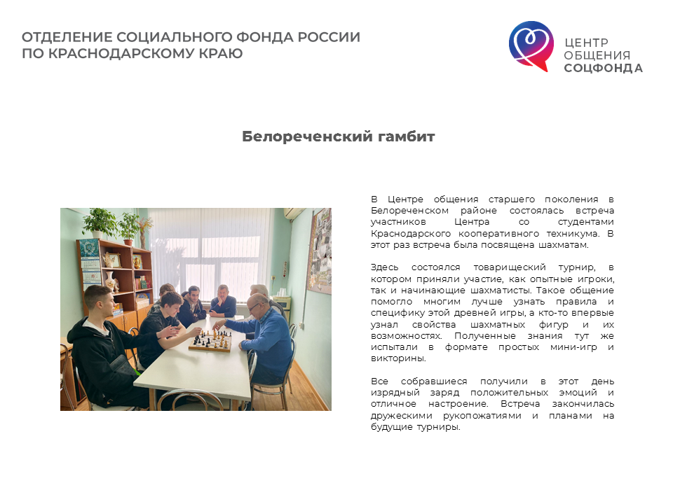 На базе клиентской службы в Белореченском районе ОСФР по Краснодарскому краю работает Центр общения старшего поколения (ЦОСП).