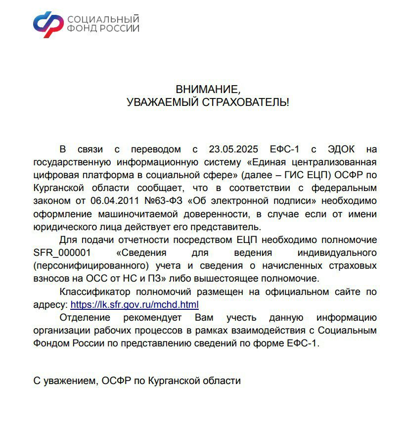 Отделение СФР по Курганской области рекомендует всем страхователям (независимо от численности работников) переходить на электронное взаимодействие с Социальным фондом Российской Федерации, поскольку электронный документооборот является прогрессивной и перспективной системой передачи данных: