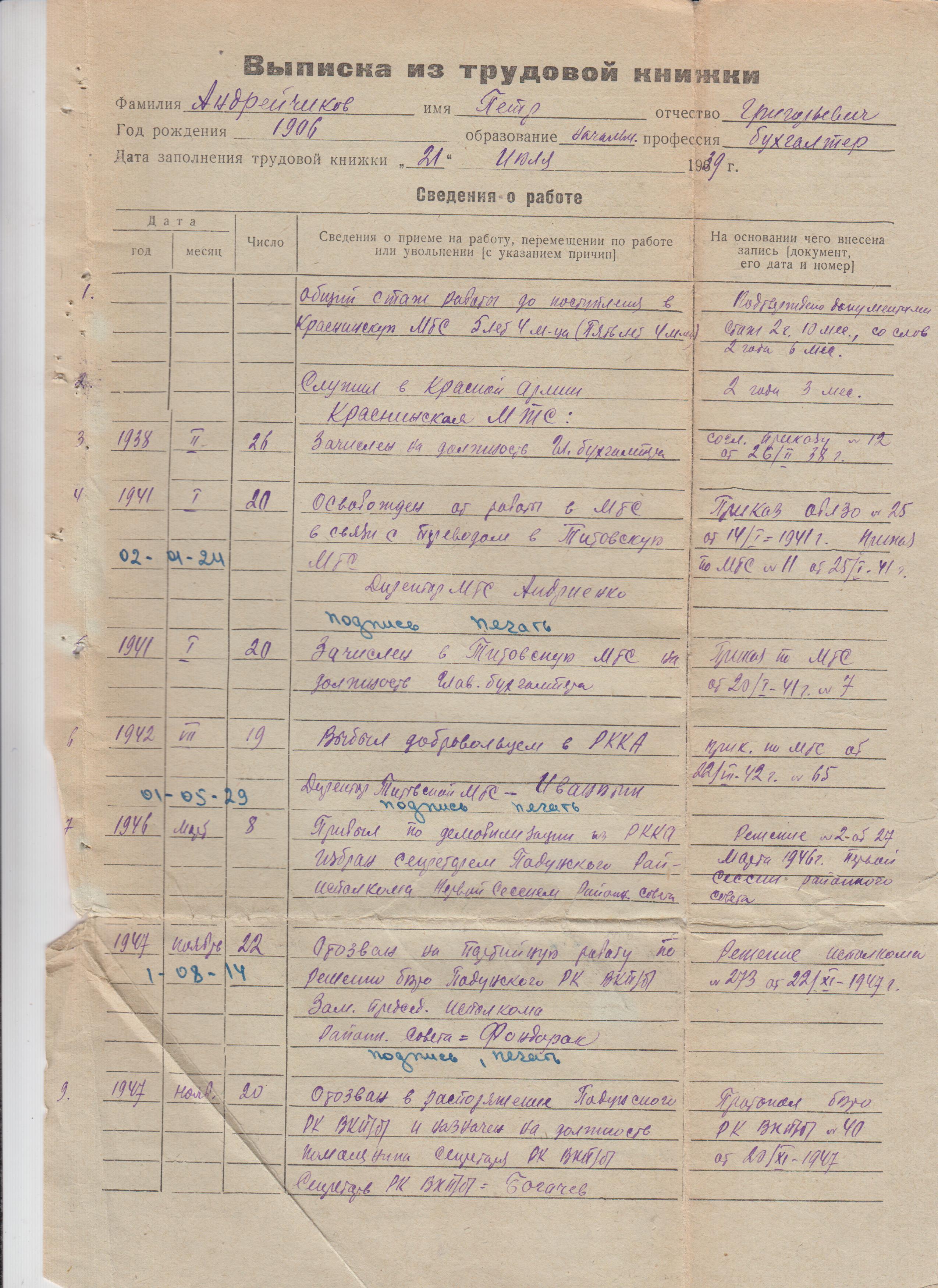 Как следует из справки сельхозартели им. Молотова от 20 ноября 1953 года № 18/32 Петр Григорьевич Андрейчиков начал трудиться в апреле 1933 года бухгалтером в колхозе «Верный путь». Далее по выписке из трудовой книжки: с 1938 по 1941 – бухгалтер в Краснинской машинно-тракторной станции, 20 января 1941 переведен бухгалтером в Титовскую МТС, 19 июля 1942 года – выбыл добровольцем в Рабоче-Крестьянскую Красную армию – приказ по МТС от 22.07.1942 № 65.