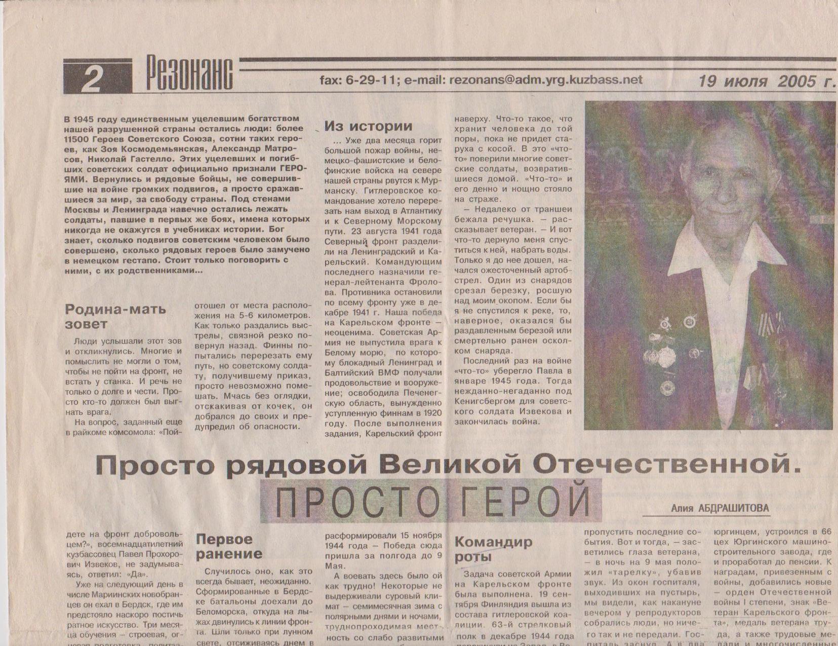 Павел Прохорович Извеков - простой рядовой Великой Отечественной войны. В далекие 30-е годы мечтал по окончании школы получить образование учителя. Но сбыться мечте не удалось. Окончив в 1939 году неполную среднюю школу, П. Извеков стал работать на Кийском карьере, а с августа 1941 года переводом был направлен в дистанцию пути Красноярской железной дороги. Уже 8 октября 1941 года был призван в Красную Армию. Старший сержант Извеков служил в действующей армии с 1942 по 1945 год, воевал на Карельском, Белорусском фронтах. За мужество и храбрость награжден 13-ю медалями и тремя орденами. Был дважды ранен, второй раз уже в конце войны тяжело. Демобилизовался в июле 1945 года.