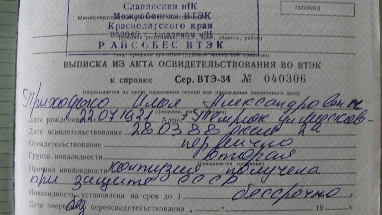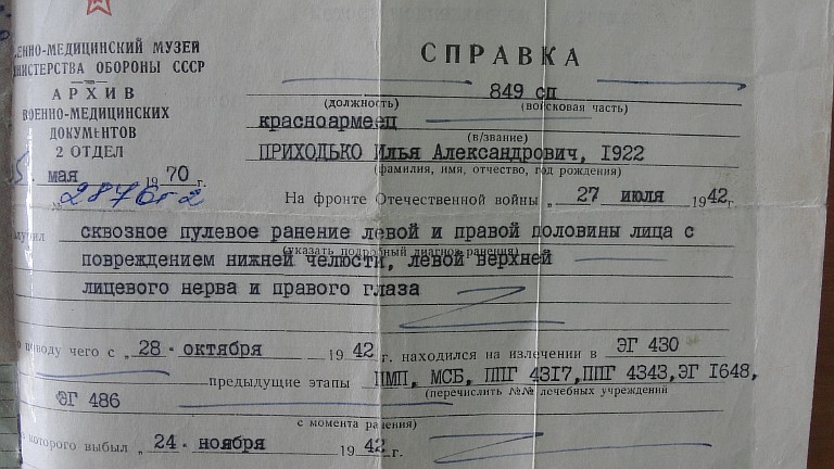 В 1941 году Илья Приходько был призван на службу в Красную Армию. 27 июля 1942 года получил тяжелое ранение. С июля 1942 по март 1943 находился на излечении в госпитале № 430 г. Канска Красноярского края (справка Яйского районного военного комиссариата). В марте 1943 года был демобилизован.