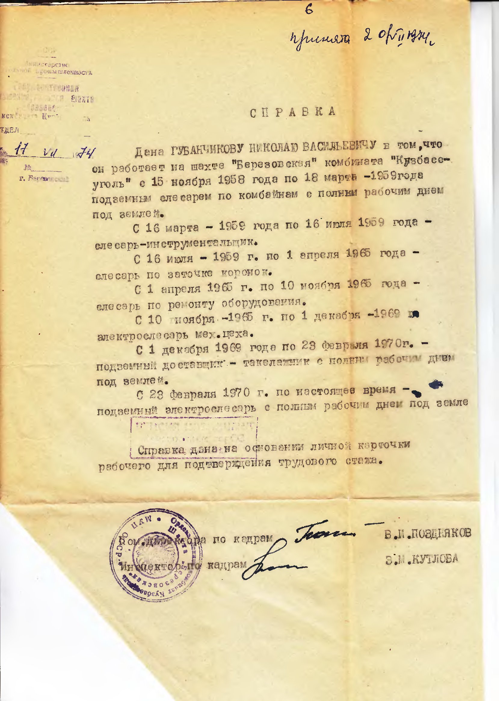 Наш дед Губанчиков Николай Васильевич, прошел войну, внес личный вклад в строительство градообразующей шахты города Березовского. Мы гордимся им!