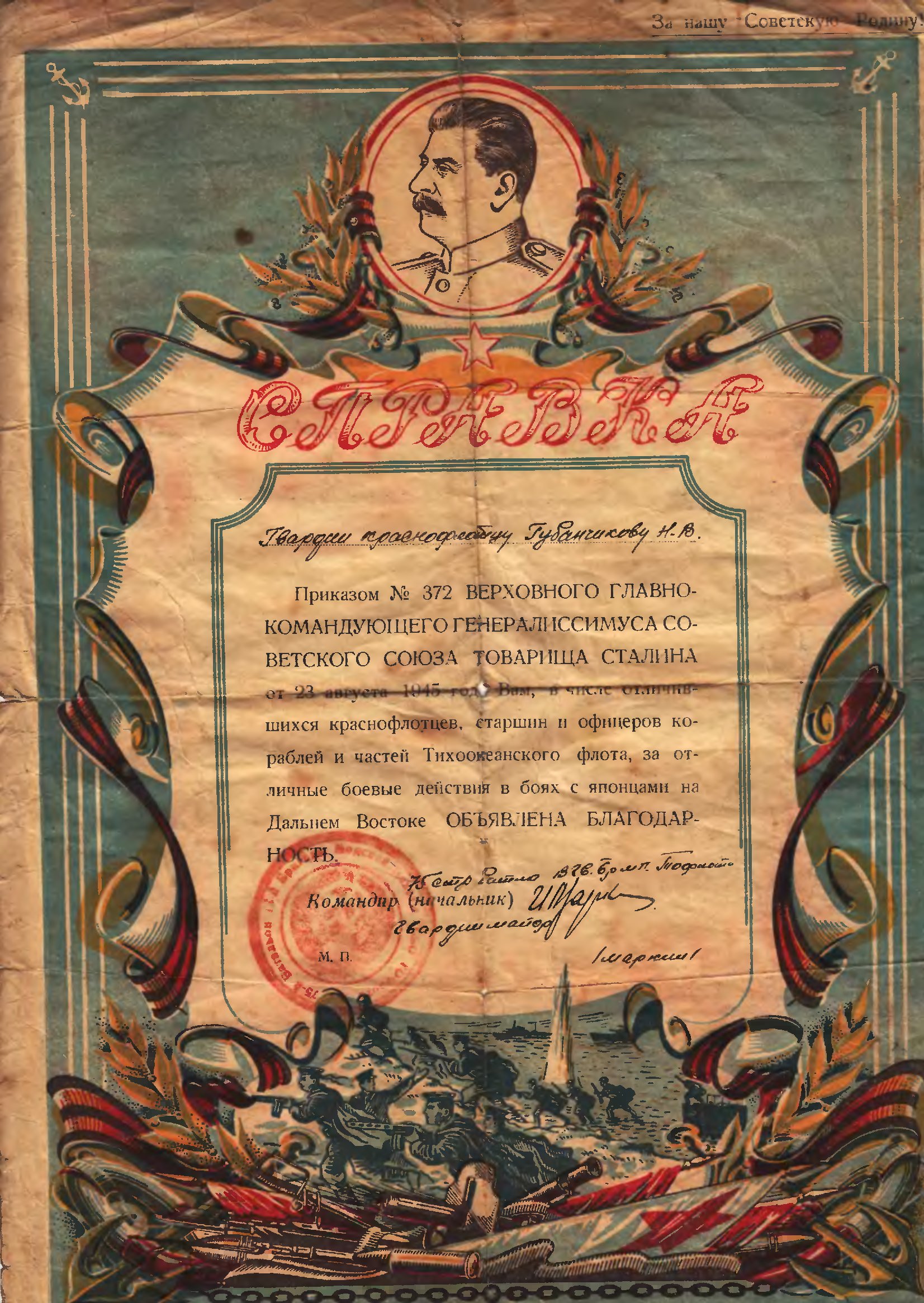 В Пенсионном деле деда хранится Благодарность за отличные боевые действия в боях с японцами на Дальнем Востоке.