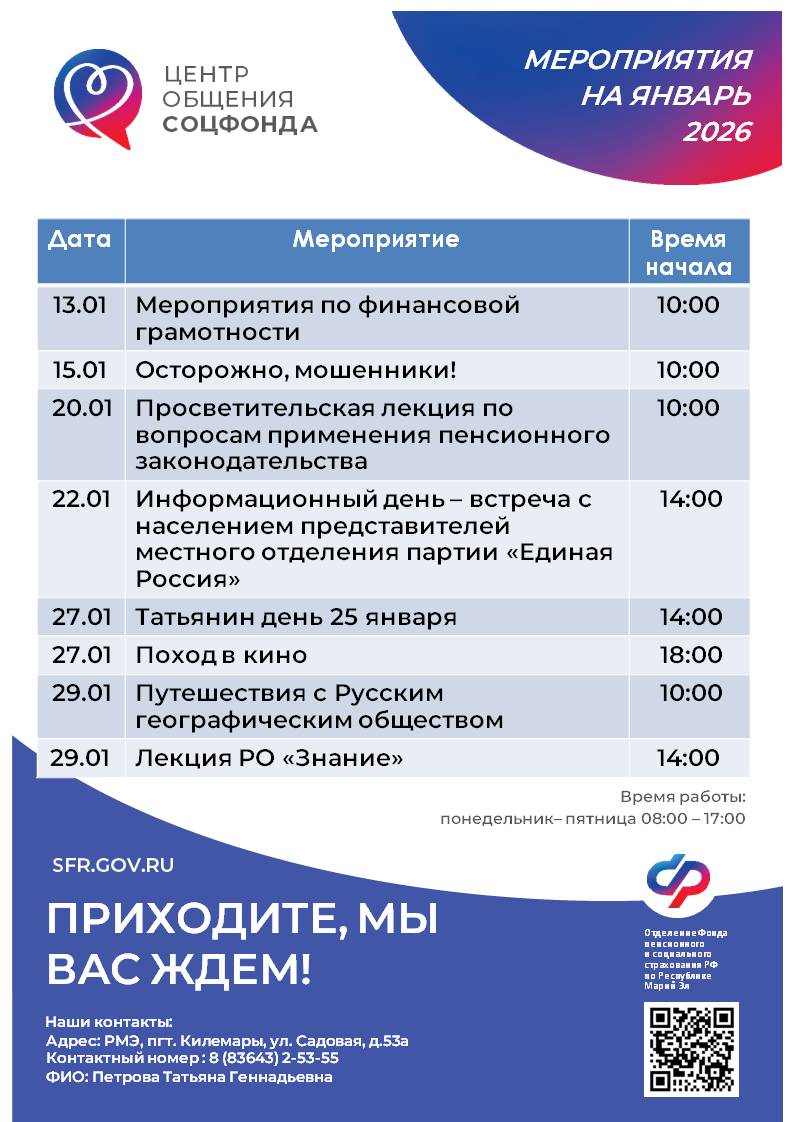 План мероприятий «Центра общения старшего поколения» в 2026 году (пгт. Килемары):