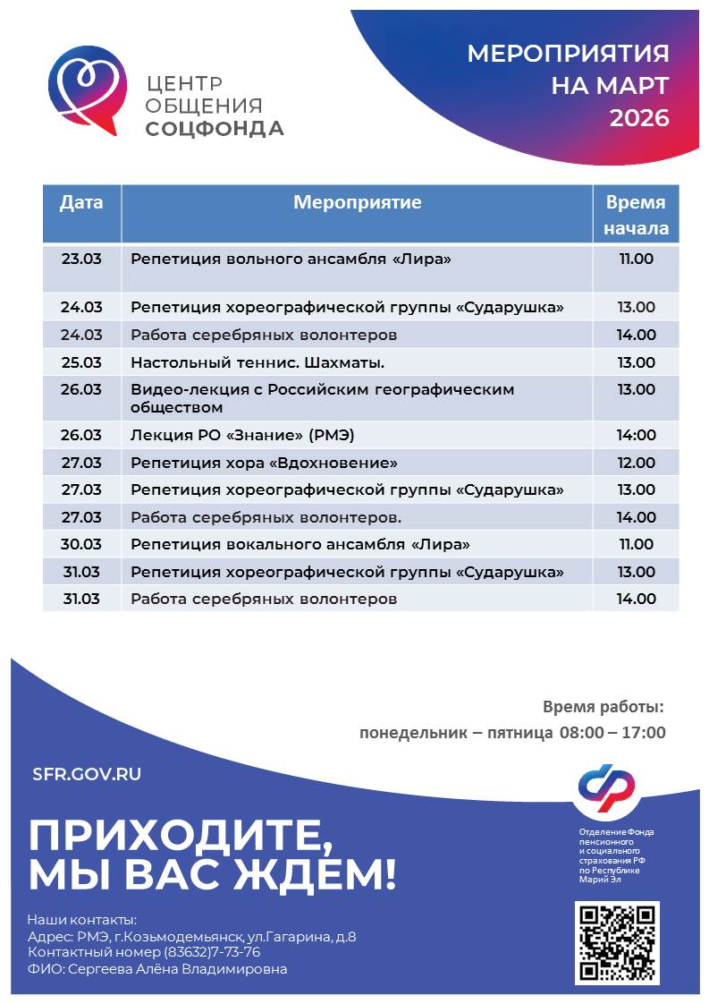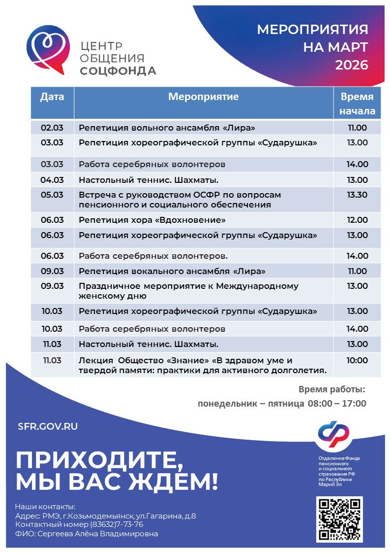 План мероприятий «Центра общения старшего поколения» в 2026 году (г. Козьмодемьянск):