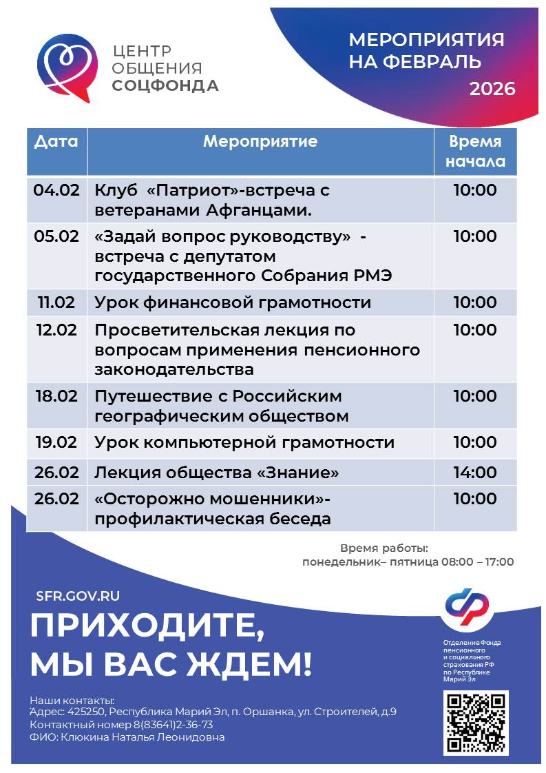 | декабрь 2025 года | Встреча с руководством ОСФР по вопросам пенсионного и социального обеспечения для получателей пенсий и иных социальных выплат, а также граждан предпенсионного возраста в режиме ВКС | Онлайн-лекция |