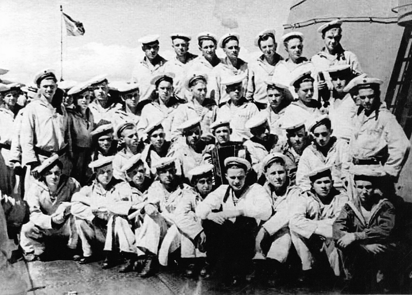 С матросами в свободное от несения вахты время. На палубе крейсера "Калинин". Фотография сделана по прибытию на крейсер