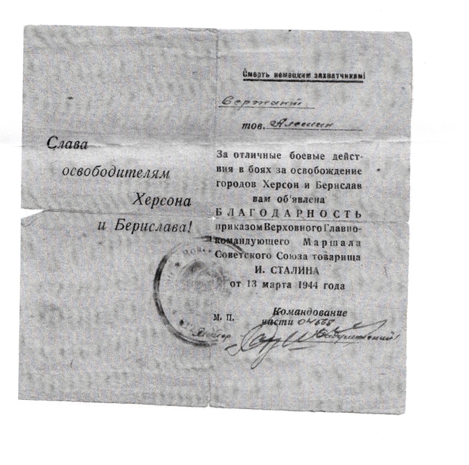 Мой отец, Алешин Василий Григорьевич, 13 марта 1921 года рождения, родился в с.Жегалово Пурдашанского района (ныне Темниковский район) Республики Мордовия. Был призван в ряды Советской Армии в сентябре 1940 года на Кавказ в г.Гори. С момента начала войны воевал в звании сержанта в 985 артиллерийском полку 320-й Енакиевской стрелковой дивизии 4-го Украинского фронта. 24 октября 1944 года в районе юго-западнее 2-го километра станции г. Халес (Венгрия) под ураганным огнем артиллерии противника три раза выходил на линию огня для наведения связи, чем обеспечил управление огнем и своевременное открытие огня нашей артиллерии для подавления огневых точек противника. 25 октября 1944 года в том же районе, когда артиллерией противника была перебита связь во многих местах, мой отец лично выходил дважды на линию огня и под сильным пулеметным и ружейным огнем противника быстро исправил повреждения, тем самым обеспечил бесперебойную работу связи в бою. 26 октября 1944 года в г. Халес (Венгрия) наводил линию связи под сильным огнем противника, был тяжело контужен и в бессознательном состоянии эвакуирован в медицинский санитарный батальон. Находился в госпитале на лечении в г. Гаулачки. окончил войну в феврале 1945 г. в Венгрии. Приказами Верховного Главнокомандующего Маршала Советского Союза товарища Сталина от 13 марта 1944г., и 8 сентября 1943 года, за отличные боевые действия по освобождению города Енакиево, и городов Херсон и Берислав. объявлена благодарность. Награжден Орденом Великой Отечественной войны II степени, Орденом «Красной звезды» , Медалью «За Отвагу!». После войны работал на Жегаловском крахмальном заводе.