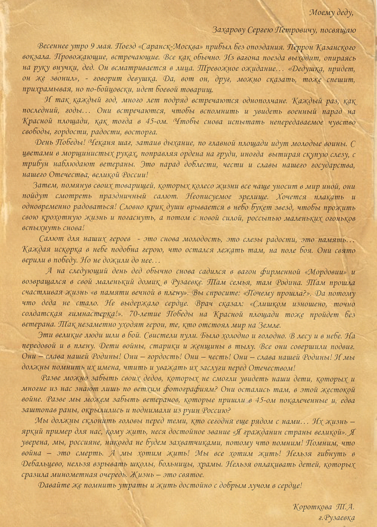 Мой отец, Купряшкин Иван Кириллович, 31.01.1923 года рождения, уроженец с.Парапино, Ковылкинского района Республики Мордовия, участник Великой Отечественной Войны. На войне был танкистом. Великую Отечественную Войну прошел в действующей армии с 1941г. по 09.05.1945 года. С однополчанами с ненавистью гнал фашистских оккупантов с нашей родной земли, защищая свою Родину. Дошел до Берлина с Победой.