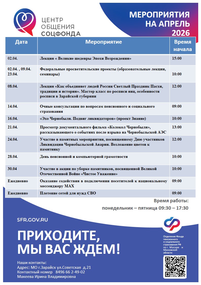 Центр общения старшего поколения расположен по адресу: Московская область, г. Зарайск, ул. Советская, д. 21
