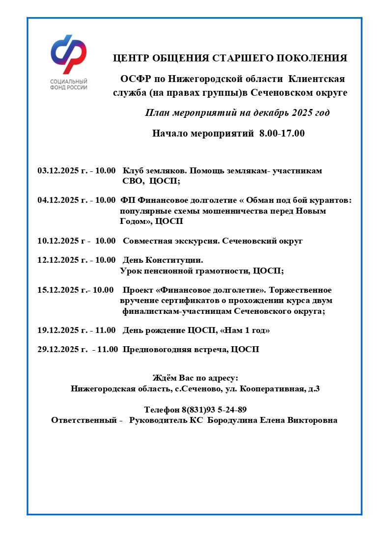 19 декабря 2024 г. ,на базе клиентской службы Сеченовского муниципального округа Нижегородского отделения фонда пенсионного и социального страхования РФ по Нижегородской области открылся Центр общения старшего поколения.