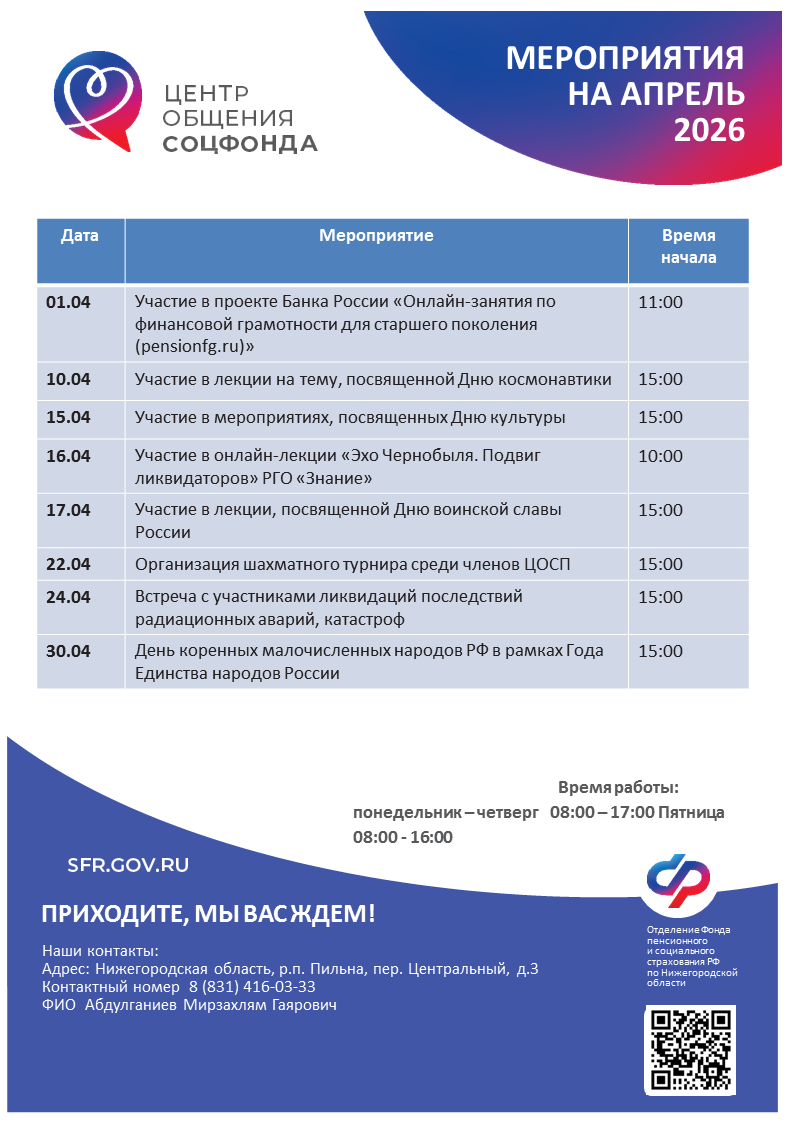 Центр общения старшего поколения был открыт 18 марта 2025 года на базе клиентской службы Отделения Социального фонда России в р.п. Пильна.