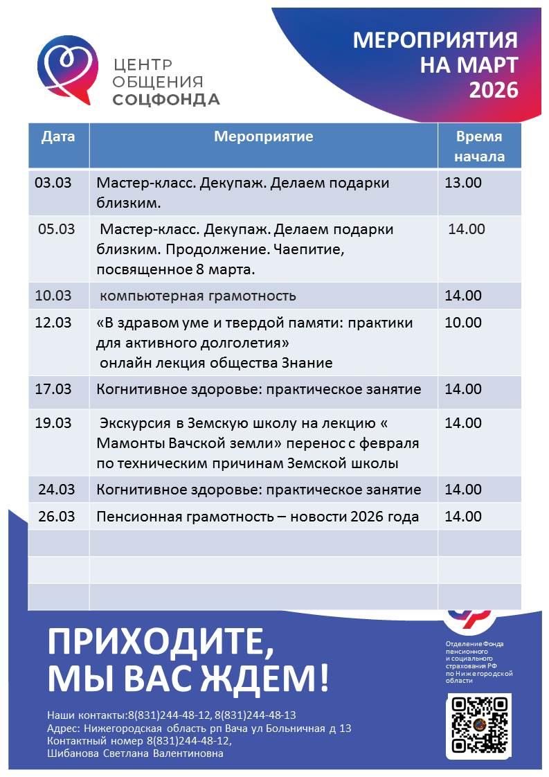 Центр общения старшего поколения был открыт в августе 2025 года на базе клиентской службы Отделения Социального фонда России в р.п. Вача.
