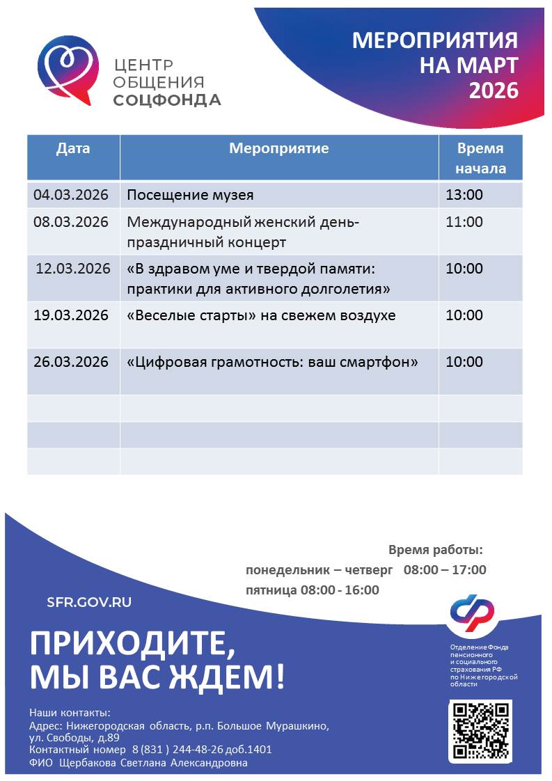 Центр общения старшего поколения был открыт в августе 2025 года на базе клиентской службы Отделения Социального фонда России в р.п. Большое Мурашкино.