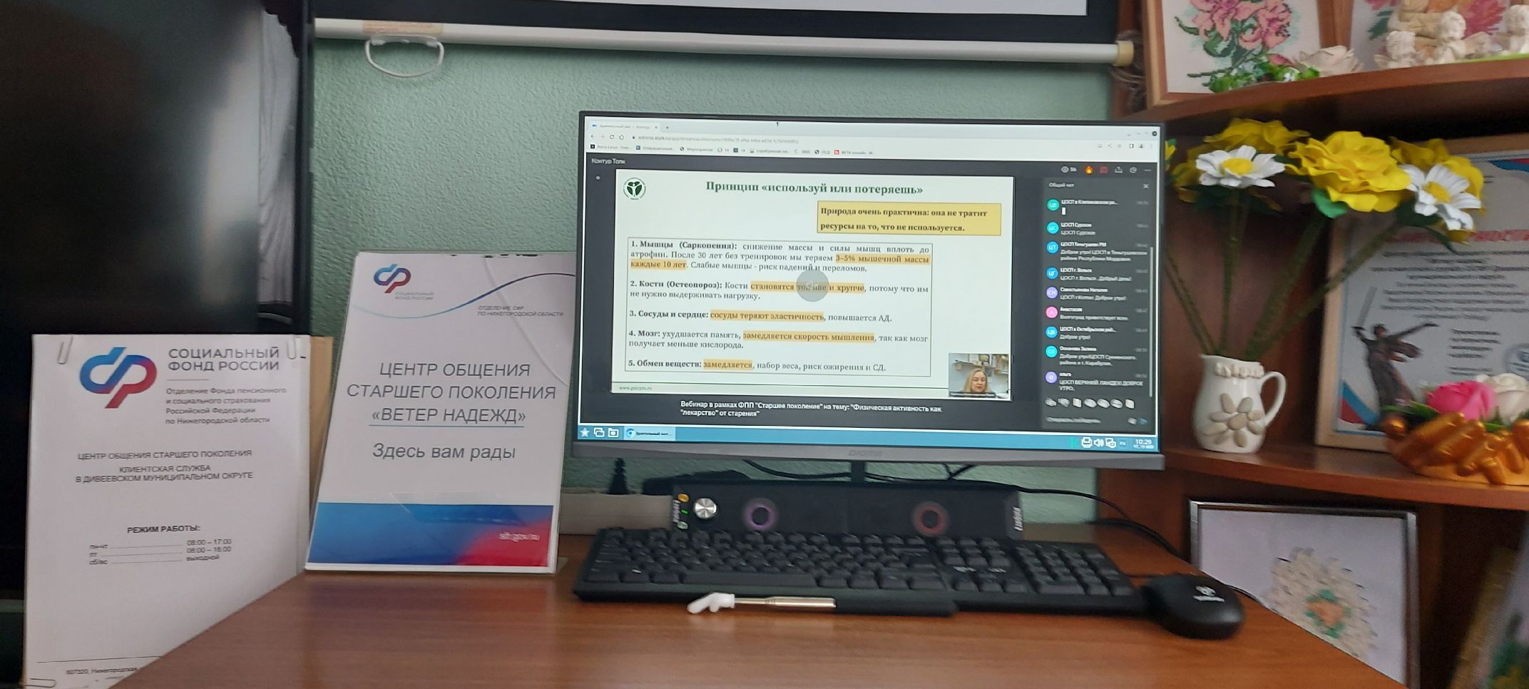 19 февраля 2026 года участники Центра общения старшего поколения «Ветер Надежд» на базе клиентской службы (на правах группы) в Дивеевском муниципальном округе прослушали онлайн - лекцию федерального проекта «Здоровое долголетие» на тему: «Физическая активность как лекарство от старения».