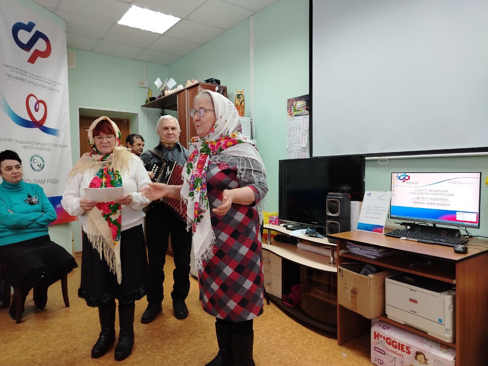 Активисты центра на сцене пели народные песни и играли на баяне в ансамбле «Надежда». Гости благодарными аплодисментами встречали и провожали ансамбль «Надежда».