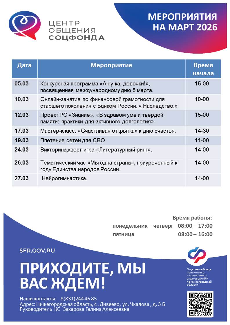 Центр общения старшего поколения был открыт 31 октября 2023 года на базе клиентской службы Отделения Социального фонда России в с. Дивеево.