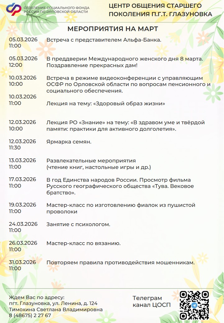 Центр общения старшего поколения в Глазуновском районе был открыт 26 апреля 2024 года на базе клиентской службы Отделения Социального фонда России по Орловской области.