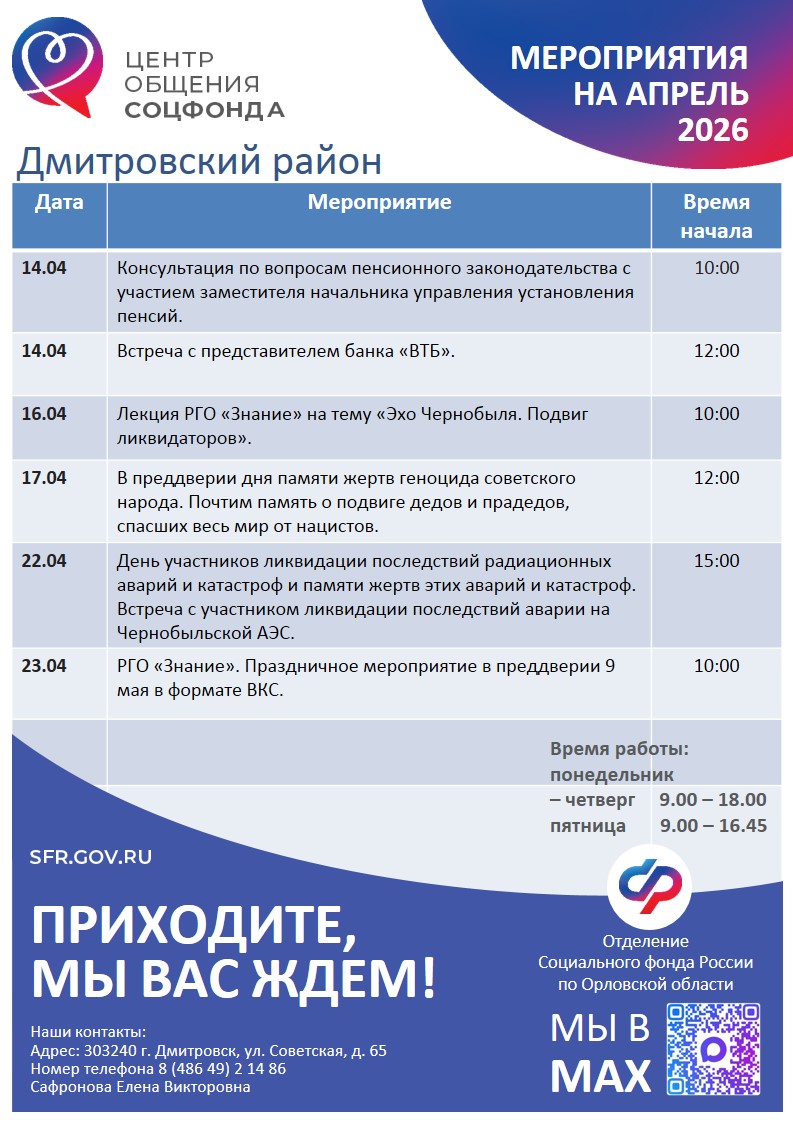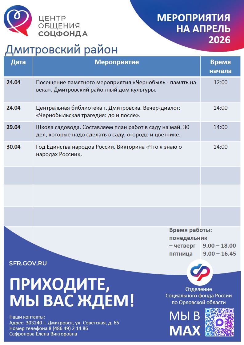 Центр общения старшего поколения в Дмитровском районе был открыт 15 мая 2025 года на базе клиентской службы Отделения Социального фонда России по Орловской области.