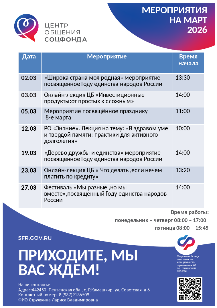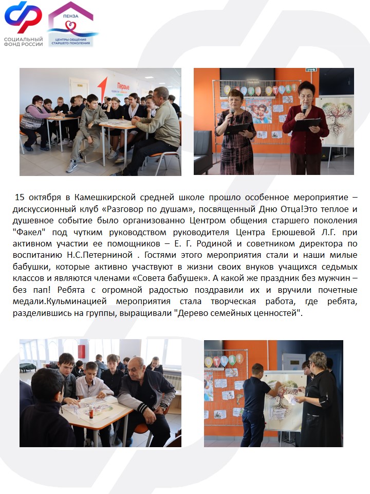 Центр общения старшего поколения в Камешкирском районе был открыт 4 апреля 2023 года на базе клиентской службы Отделения Социального фонда России по Пензенской области.