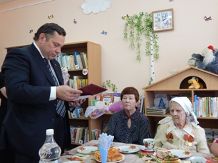 С юбилеем женщину поздравили не только члены семьи. Силами администрации сельского поселения, сельского дома культуры и библиотеки для Елены Венедиктовны устроили настоящее торжество с поздравлениями, песнями и чаепитием. Добрые слова в этот день прозвучали от главы Стряпунинского сельского поселения Ю.Н.Иванова, зам.начальника управления ПФР в Краснокамском районе О.Н.Торховой, заведующей Отделом ЗАГС Л.М.Смирновой. А Глава Краснокамского муниципального района Ю.Ю.Крестьянников торжественно вручил Елене Венедиктовне Персональное поздравление Президента Российской Федерации В.В. Путина.