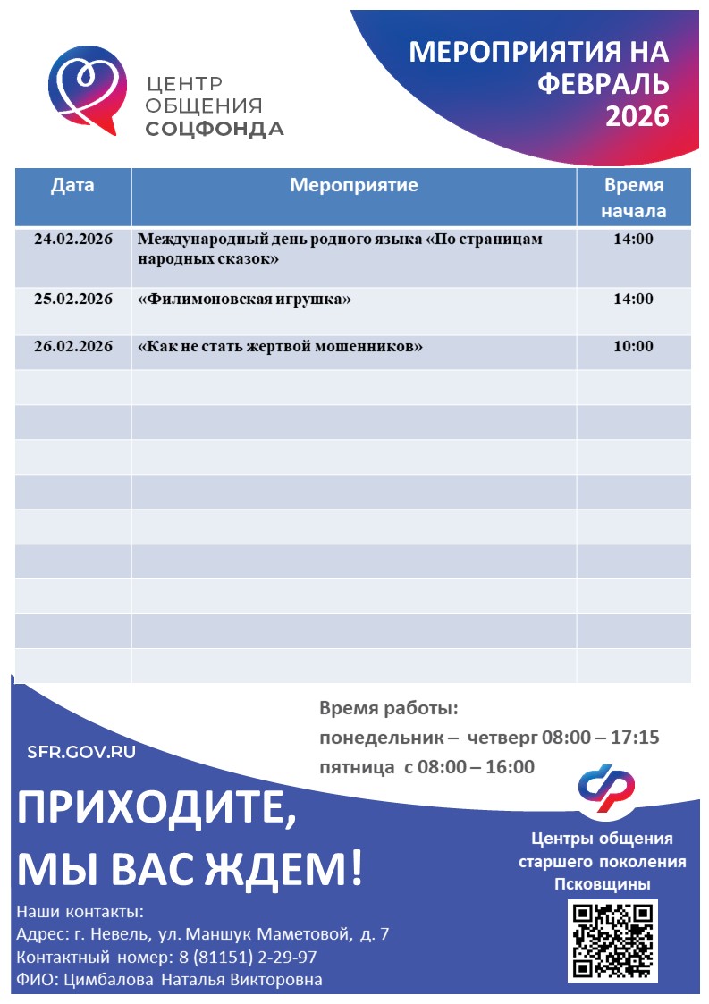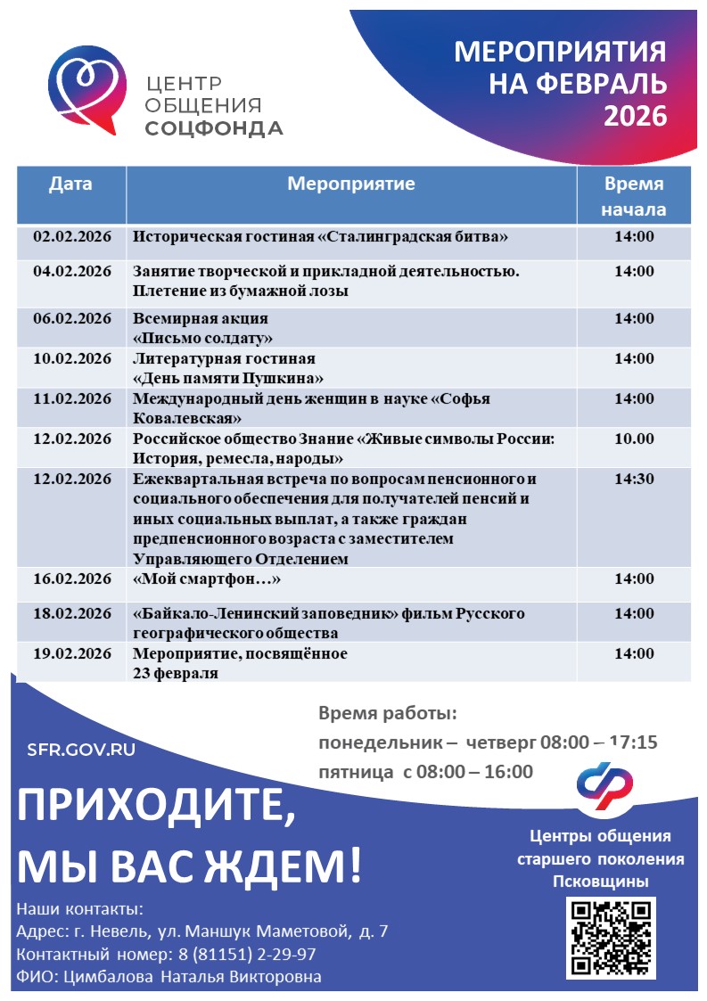 Управляющий Отделением СФР Наталья Мельникова, рассказала, что Псковская область вошла в пилотный проект по созданию Центров общения пожилых людей: организация досуга и установления дружеских контактов пожилых людей в районах области. Центр поможет пожилым людям раскрыть свои способности, найти стимулы для творческой деятельности, а также будет содействовать их активному участию в культурной, общественной жизни.