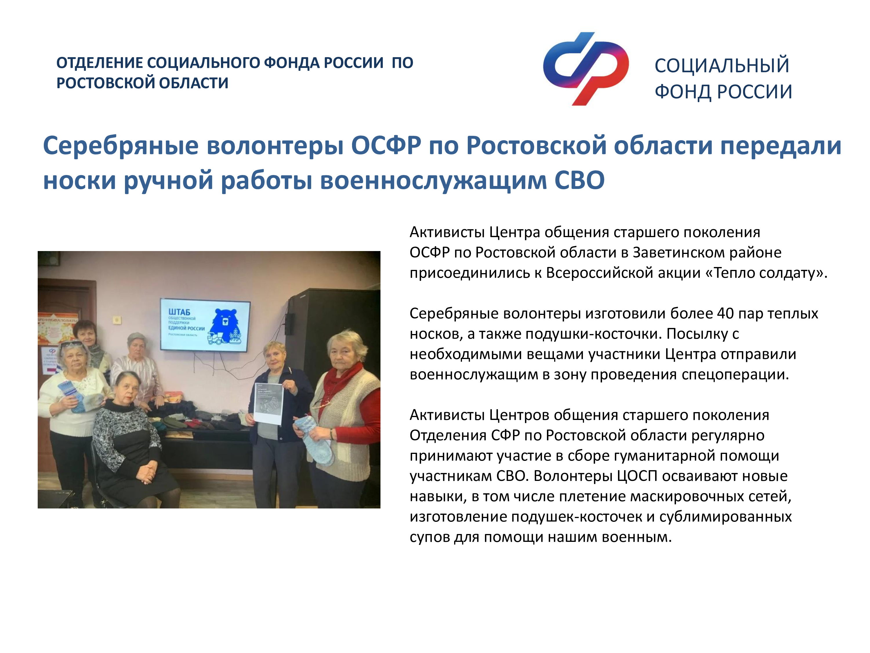 Серебряные волонтеры ОСФР по Ростовской области передали носки ручной работы военнослужащим СВО
