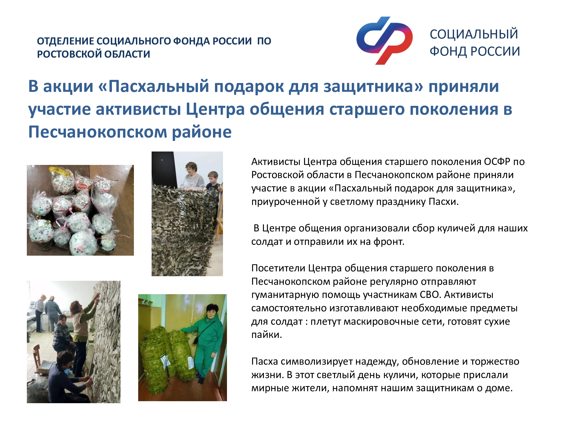 На базе клиентской службы (на правах отдела) в Песчанокопском районе ОСФР по Ростовской области работает Центр общения старшего поколения (ЦОСП).