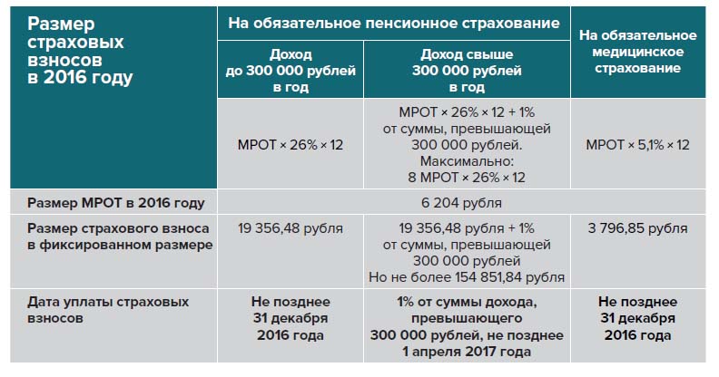Таким образом, в 2016 году, если величина дохода плательщика за расчетный период не превысит 300 000 рублей, фиксированный платеж по-прежнему составит: на обязательное пенсионное страхование - 19 356,48 руб., на обязательное медицинское страхование - 3 796,85 руб. уплатить который необходимо не позднее 31 декабря 2016 года.