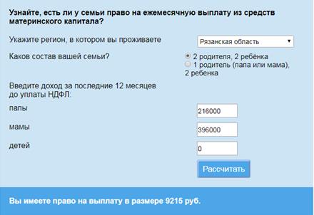 Органы Пенсионного фонда РФ в регионе производят первые ежемесячные выплаты за счёт средств материнского капитала обратившимся семьям с низким доходом. Сообщаем жителям Рязанской области о том, каким образом владелец сертификата на М(С)К может рассчитать, положено ли в отношение его семьи предоставление таких выплат.
