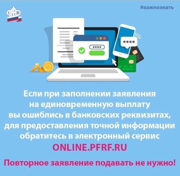 В случае, если при оформлении заявления на единовременную выплату на детей от 3 до 16 лет гражданин допустил ошибку, подавать второе заявление через портал Государственных услуг не нужно. Достоверные данные можно сообщить специалистам ПФР, обратившись на электронный сервис http://online.pfrf.ru/