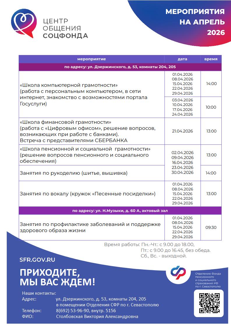 ПЛАН МЕРОПРИЯТИЙ ЦЕНТРА ОБЩЕНИЯ СТАРШЕГО ПОКОЛЕНИЯ ОТДЕЛЕНИЯ СФР ПО Г.СЕВАСТОПОЛЮ НА АПРЕЛЬ 2026 ГОДА