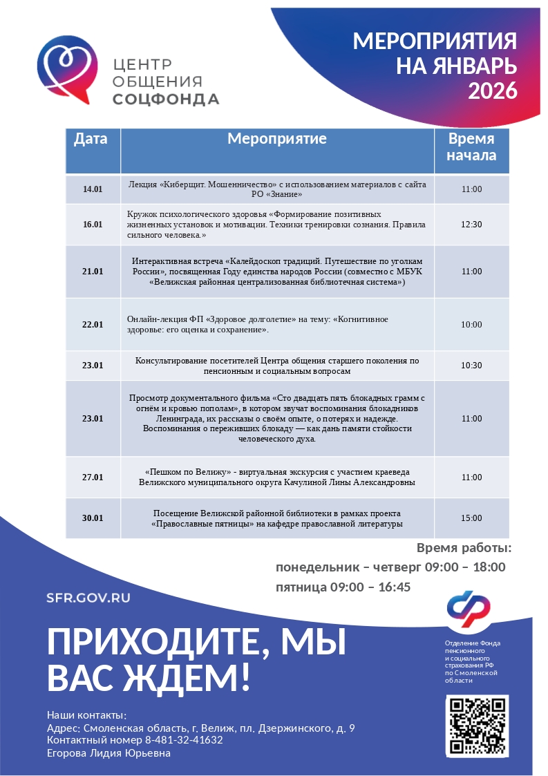 Центр общения приглашает смолян на свои мероприятия по адресу: город Велиж, площадь Дзержинского, дом 9. Предварительной записи не требуется. Ждём вас в гости!