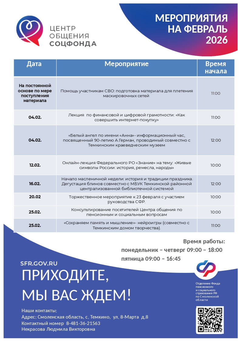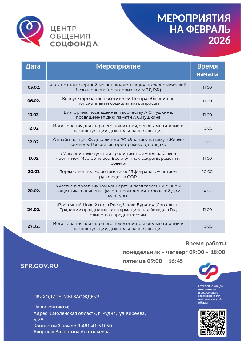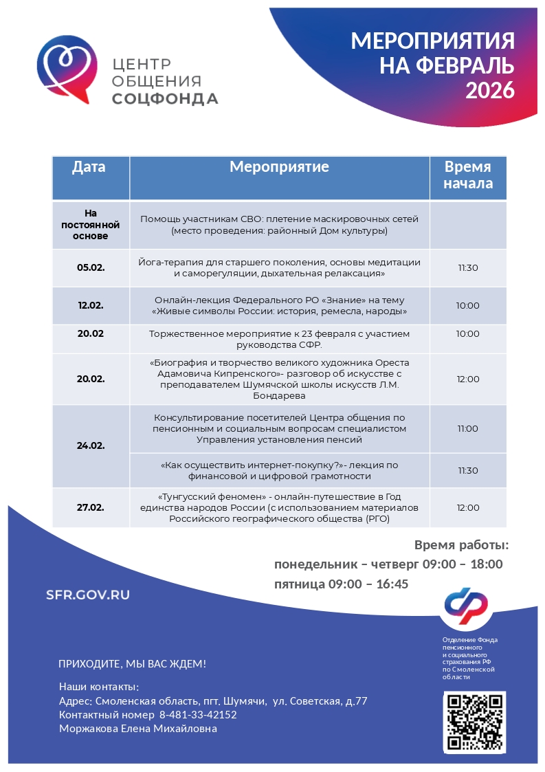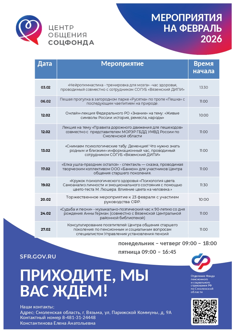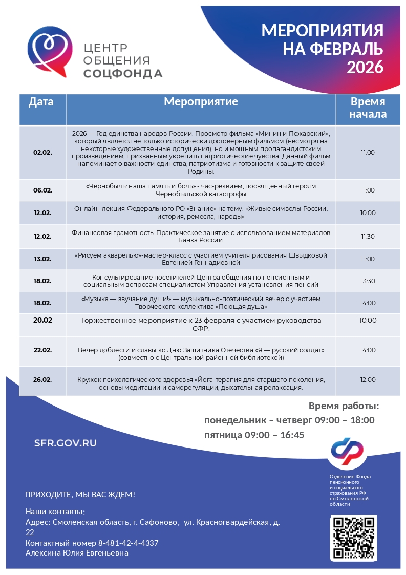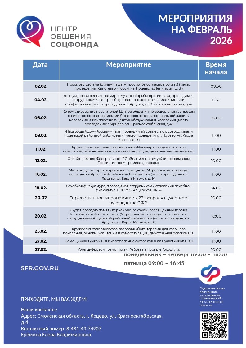С расписанием мероприятий и адресами Центров можно ознакомиться на официальном сайте Отделения СФР по Смоленской области в разделе «Информация для жителей региона».