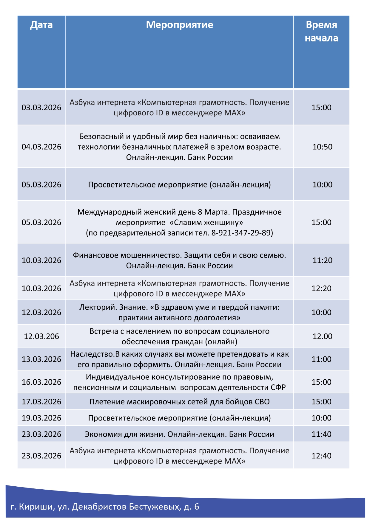 План мероприятий на месяц (март 2026)