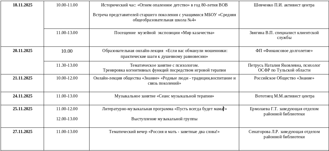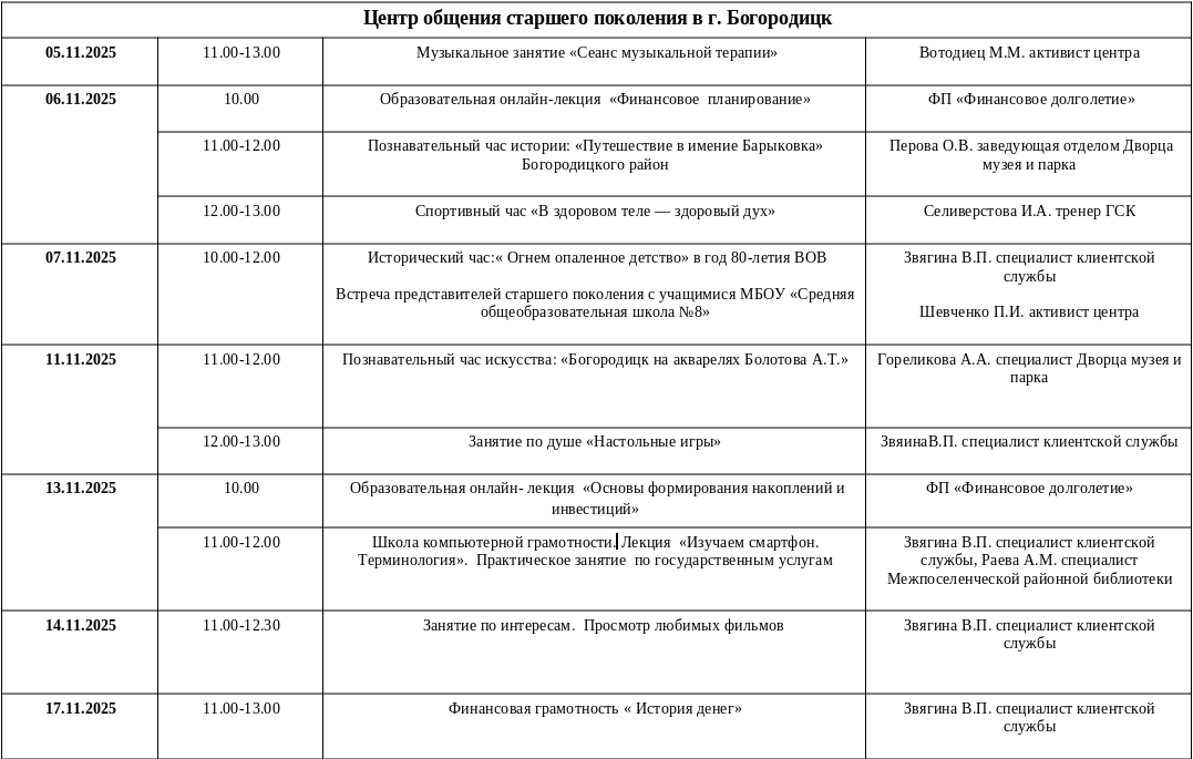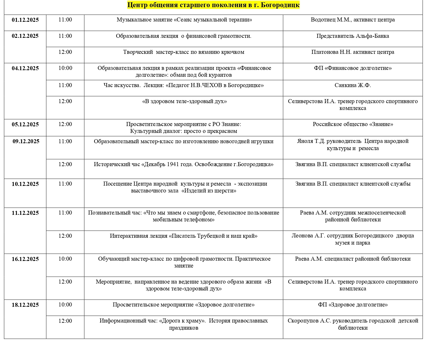 Центр общения старшего поколения "В ритме жизни" в г. Богородицке. Контакты и план мероприятий