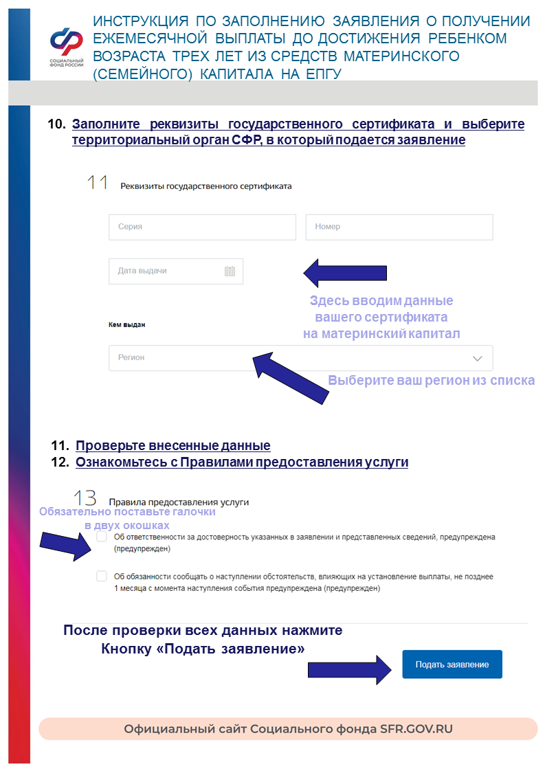 - Обратиться в территориальный орган СФР с заявлением о распоряжении средствами материнского (семейного) капитала на компенсацию затрат на приобретение товаров и услуг.