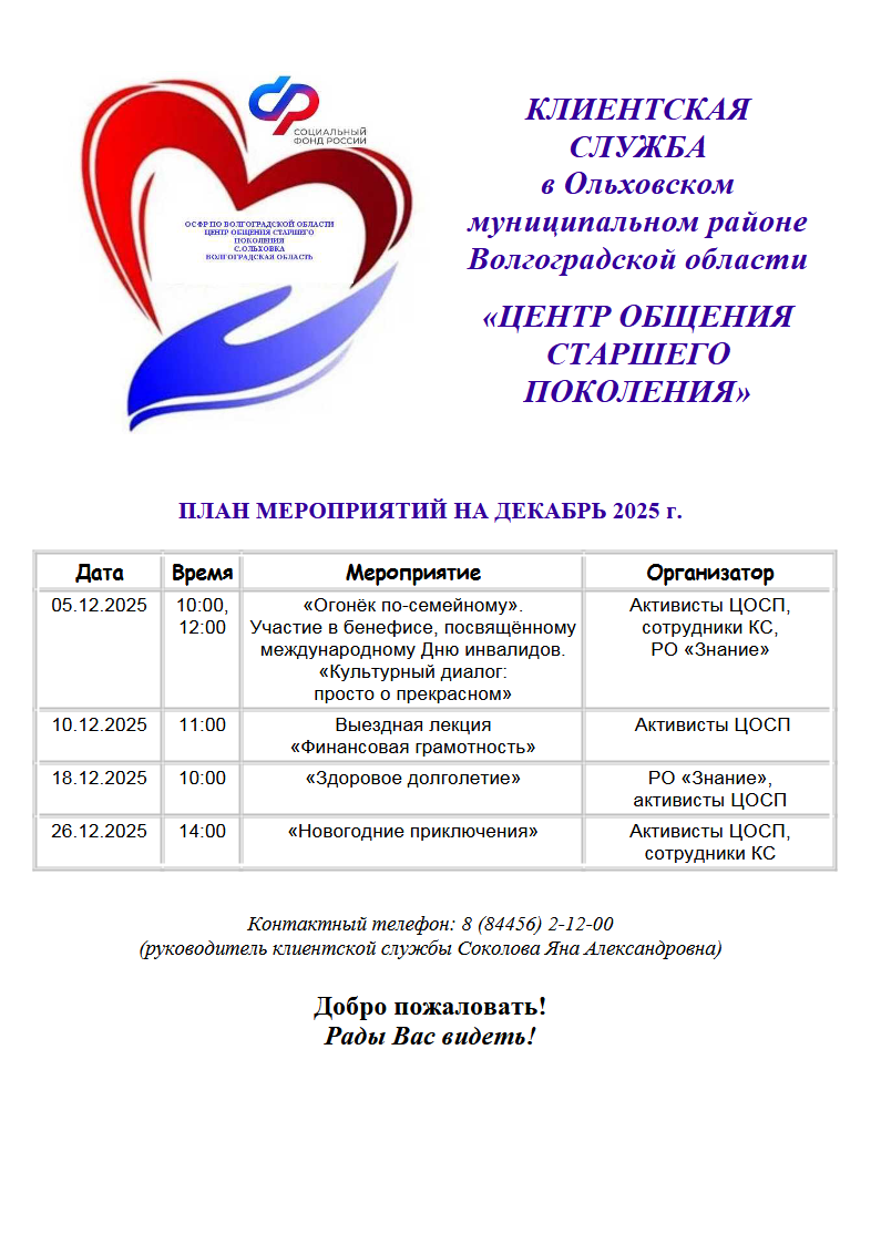 ноябрь 2024 г.На базе клиентской службы в Ольховском районе ОСФР по Волгоградской области работает Центр общения старшего поколения (ЦОСП).
