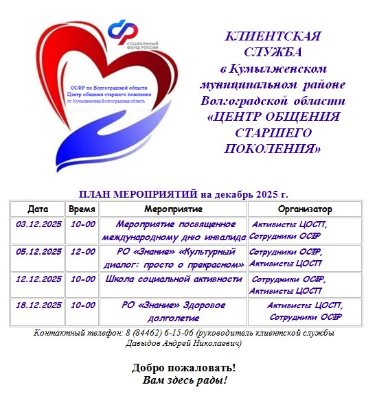 На базе клиентской службы в Кумылженском районе ОСФР по Волгоградской области работает Центр общения старшего поколения (ЦОСП).
