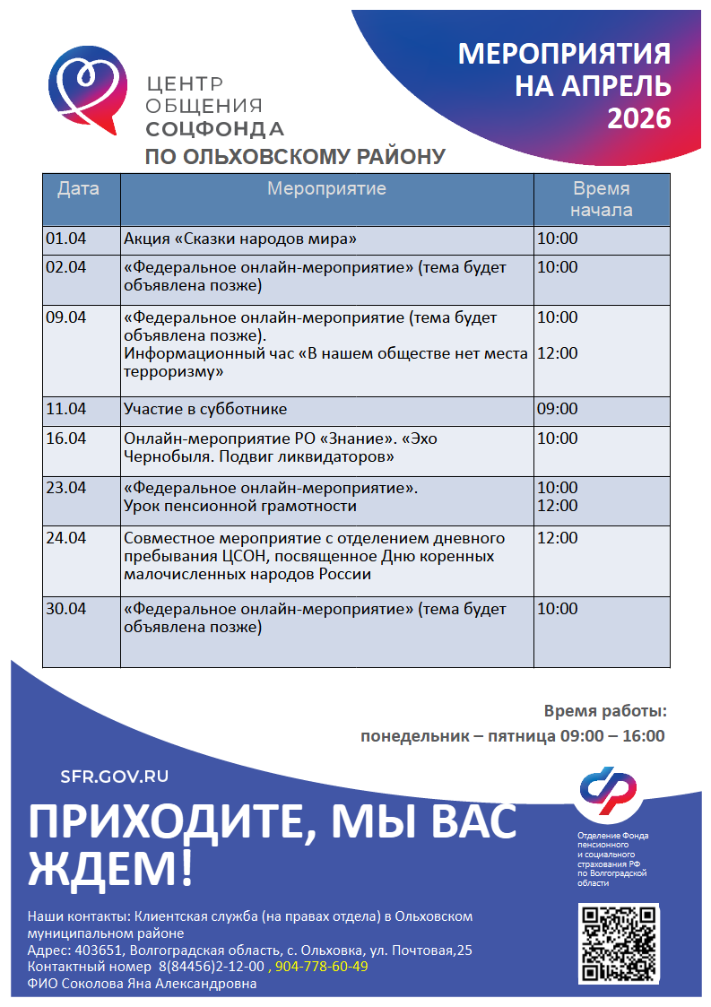 ноябрь 2024 г.На базе клиентской службы в Ольховском районе ОСФР по Волгоградской области работает Центр общения старшего поколения (ЦОСП).